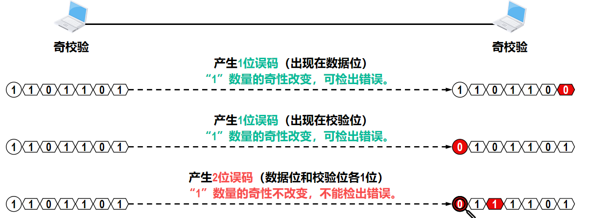 - 奇校验:是在待发送的数据后面添加 1 个校验位,使得添加该校验位后的整个数据中比特 1 的个数为奇数