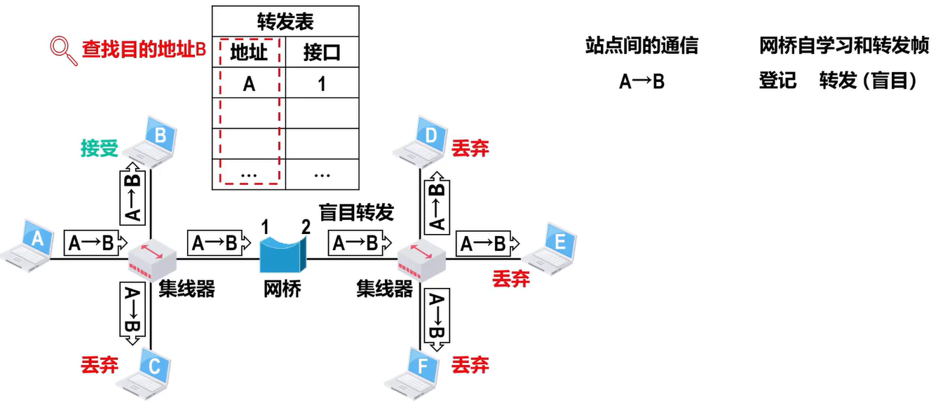 - 丢弃:网桥知道不应该转发该帧,将其丢弃