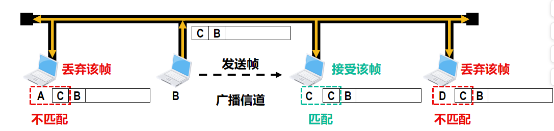 - 其他各主机中的网卡检测到帧的目的 MAC 地址是广播地址时,就接收