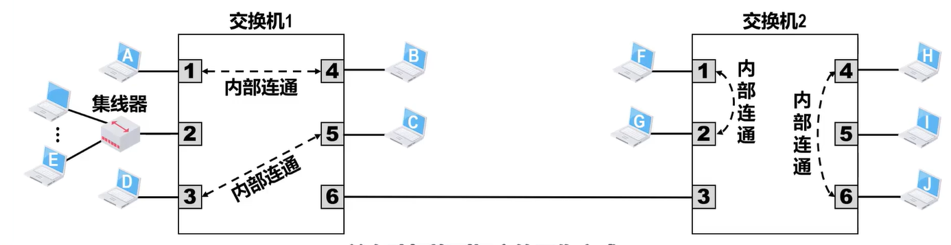 - 当交换机的接口直接与主机或其他交换机连接时,工作在全双工方式,并能同时连通多对接口,使每对相互通信的主机都能像独占通信介质那样,无冲突地传输数据,**具有并行性