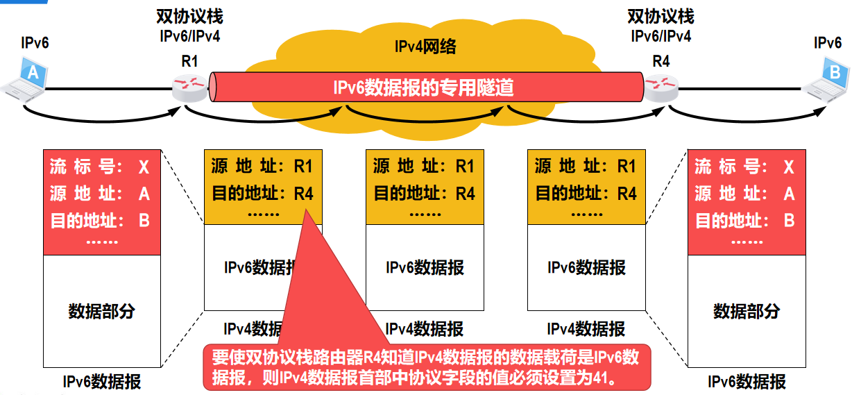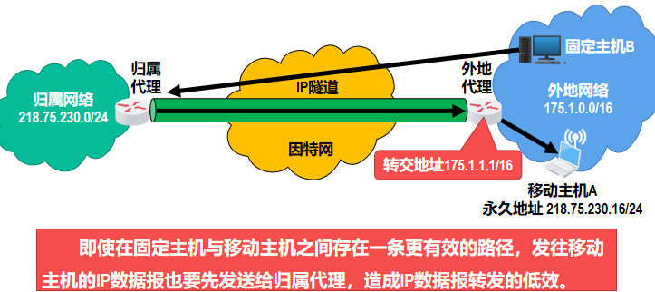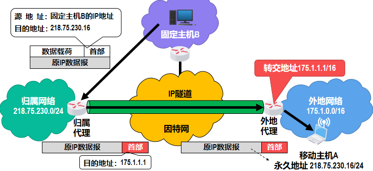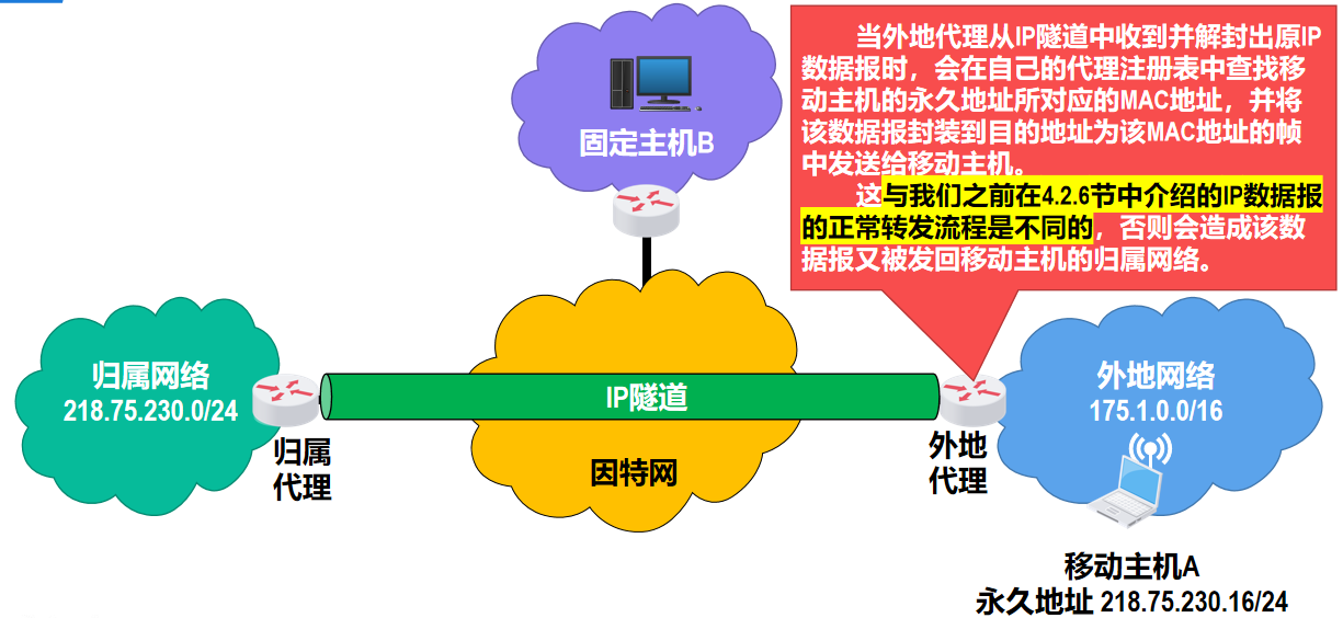 - 归属代理会将移动主机 A 的转交地址记录下来,此后归属代理会代替移动主机接收所有发送给该移动主机的 IP 数据报,并利用 IP 隧道技术将这些数据报转发给外地网络中的移动主机