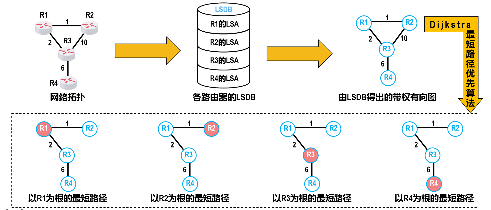 - 根据所选定的路由选择协议构造出路由表