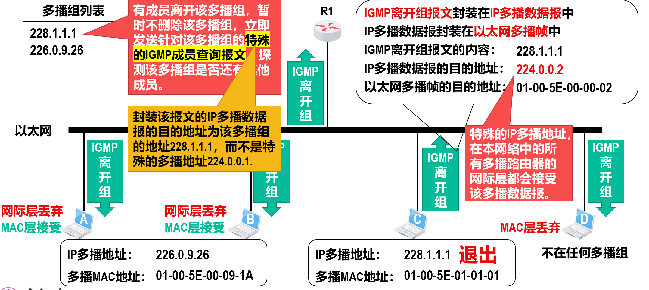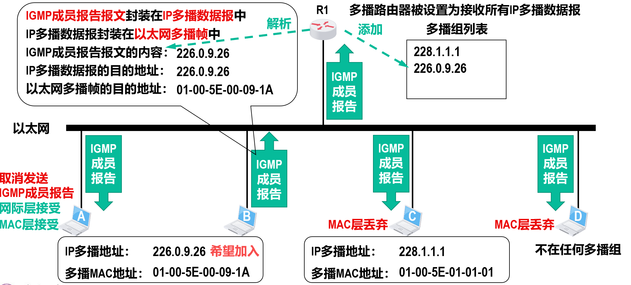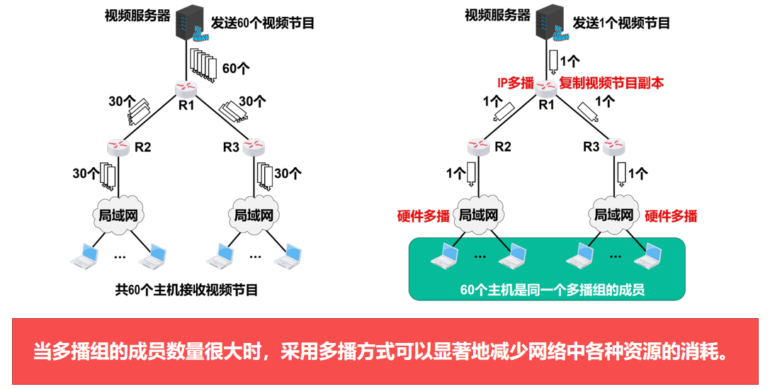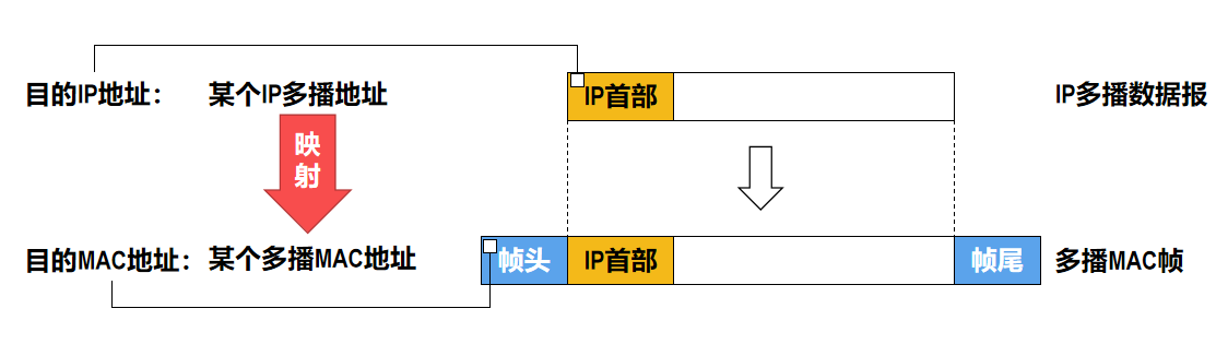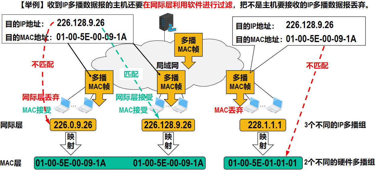 - 之后,在多播路由器所直连的局域网内,多播路由器通过硬件多播,将 IP 多播数据报发送给该多播组的所有成员