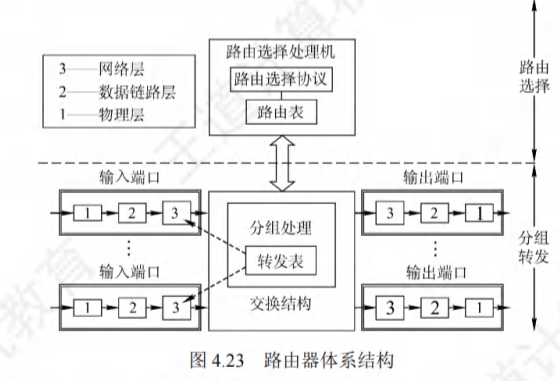 - 输入端口在物理层接收比特流,在数据链路层提取出帧,剥去帧的首部和尾部后,分组就被送入网络层的处理模块,输出端口执行相反的操作