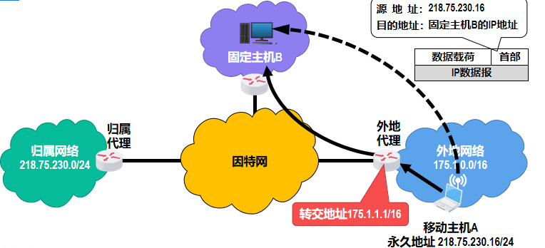 - 外地代理将移动主机 A 的永久地址记录在自己的注册表中,并向移动主机的归属代理注册该移动主机的转交地址【也可由移动主机直接进行注册】