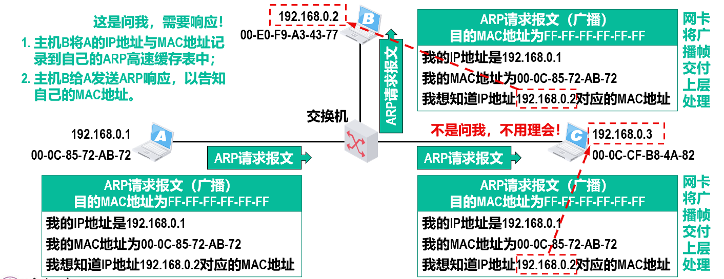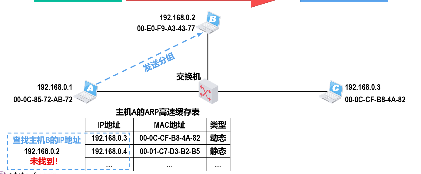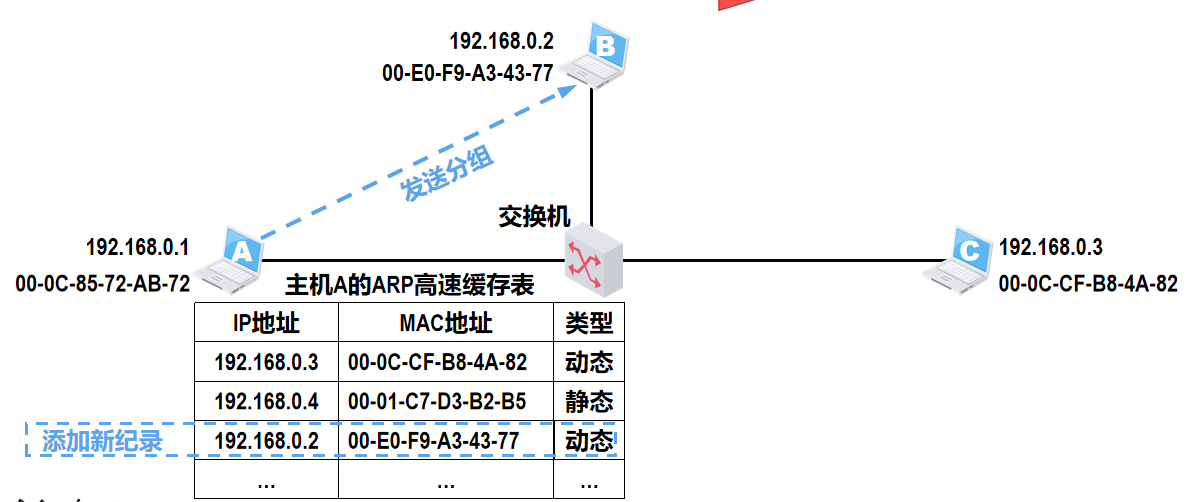 - 组成:一个分组将要发往的目的地址、分组的下一跳【下一步接收者的目的地址,实际为 MAC 地址】