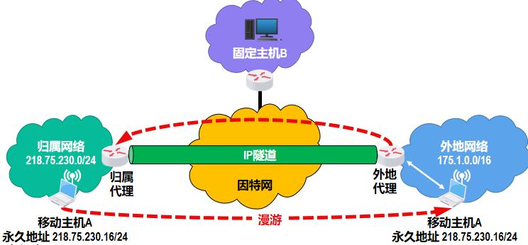 - 使得移动主机在各网络之间漫游时,仍然能够保持其原来的 IP 地址不变