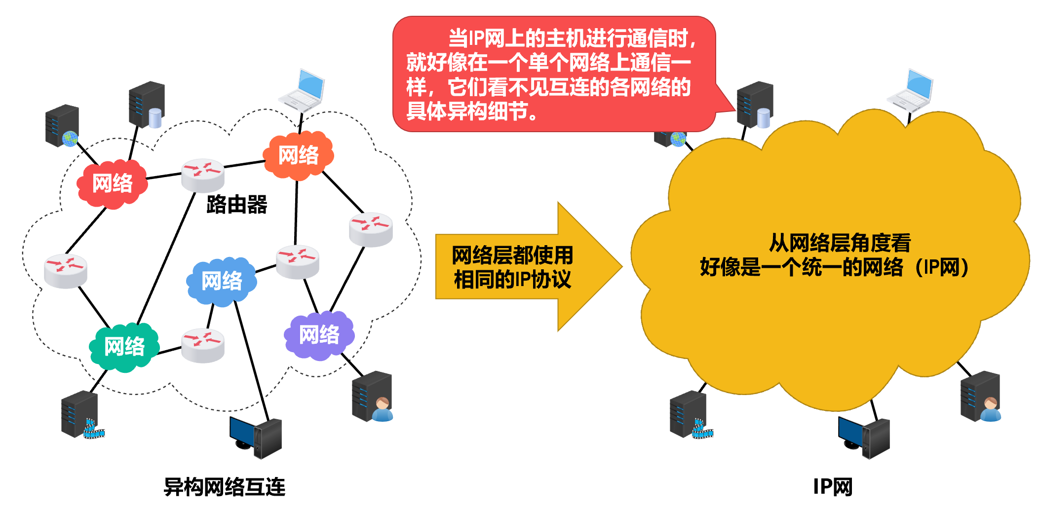 - 互连起来的各种物理网络的异构性【拓扑结构、寻址方案、差错处理方法、路由选择机制等】是客观存在的