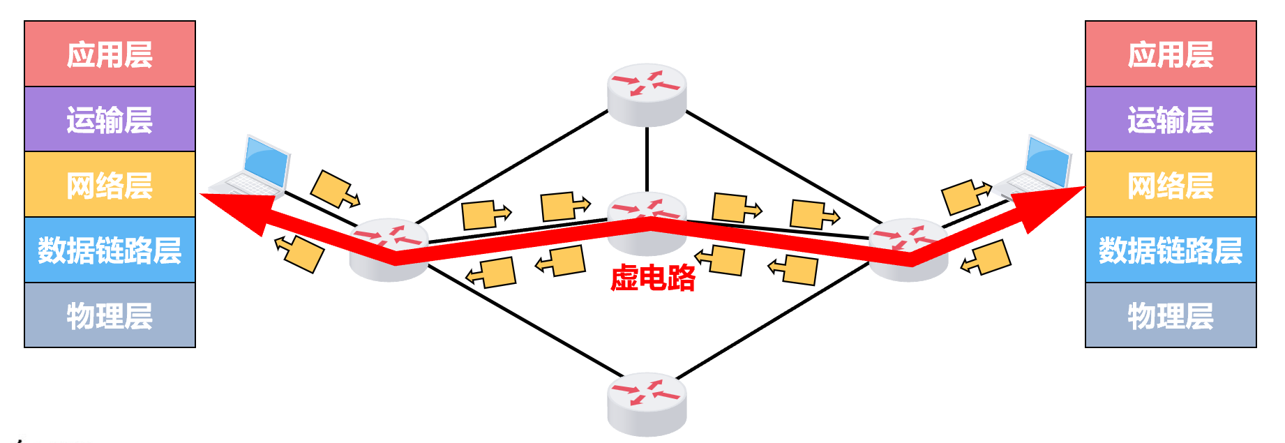 - 三个阶段:虚电路建立、数据传输、虚电路释放
