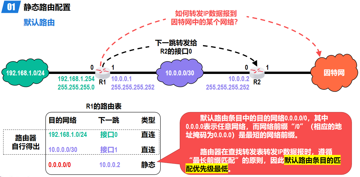 - 组成:目的网络的 IP 地址、子网掩码、下一跳 IP 地址、接口